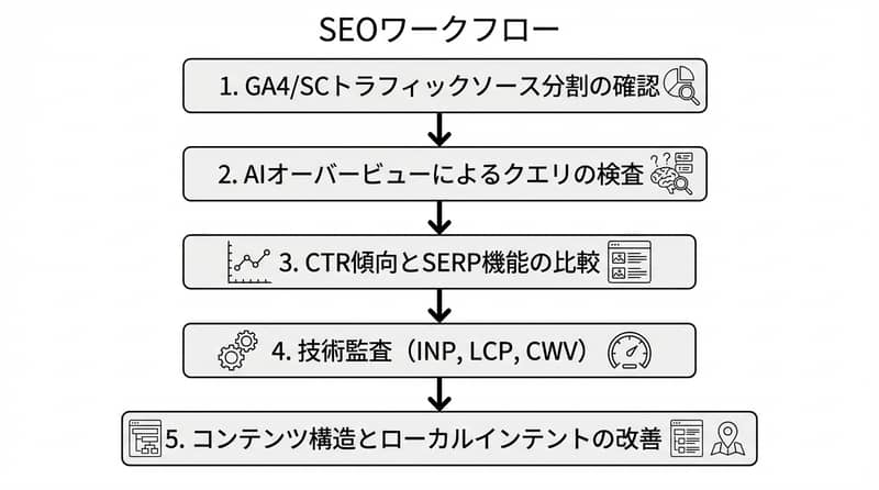 見るべきは順位だけじゃない:CTR の落ち方、SERP 機能の出現率、そしてコンバージョン(問い合わせ、予約、購入)。順位 1 位でも、上に広告とローカルパックと AI 要約が乗ったら、クリックは削られる。